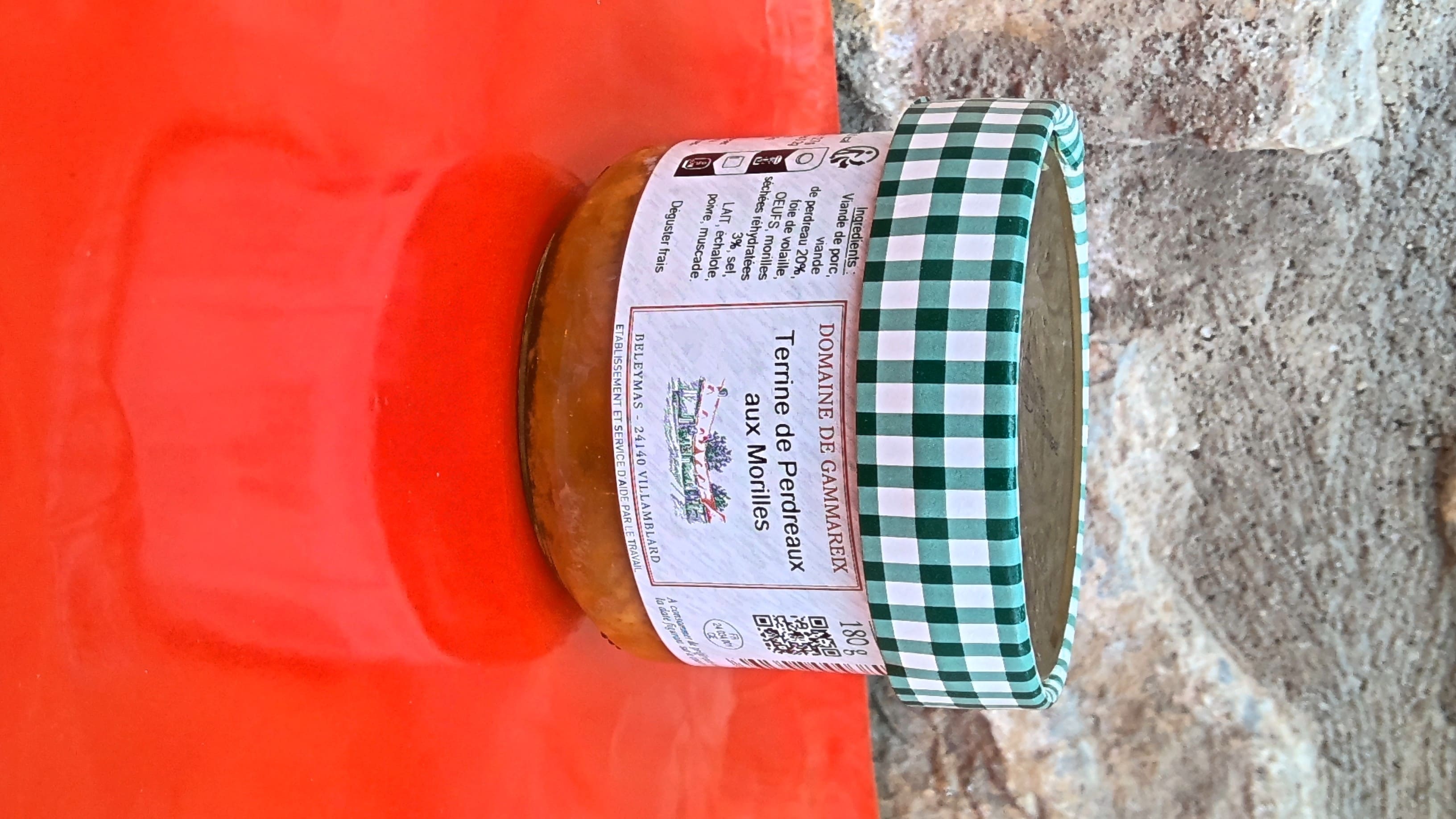 Ingrédients: viande de porc , perdreau 20%, foie de volaille, Œufs, morilles séchées réhydratées 3%, sel,lait, échalote , poivre, muscade