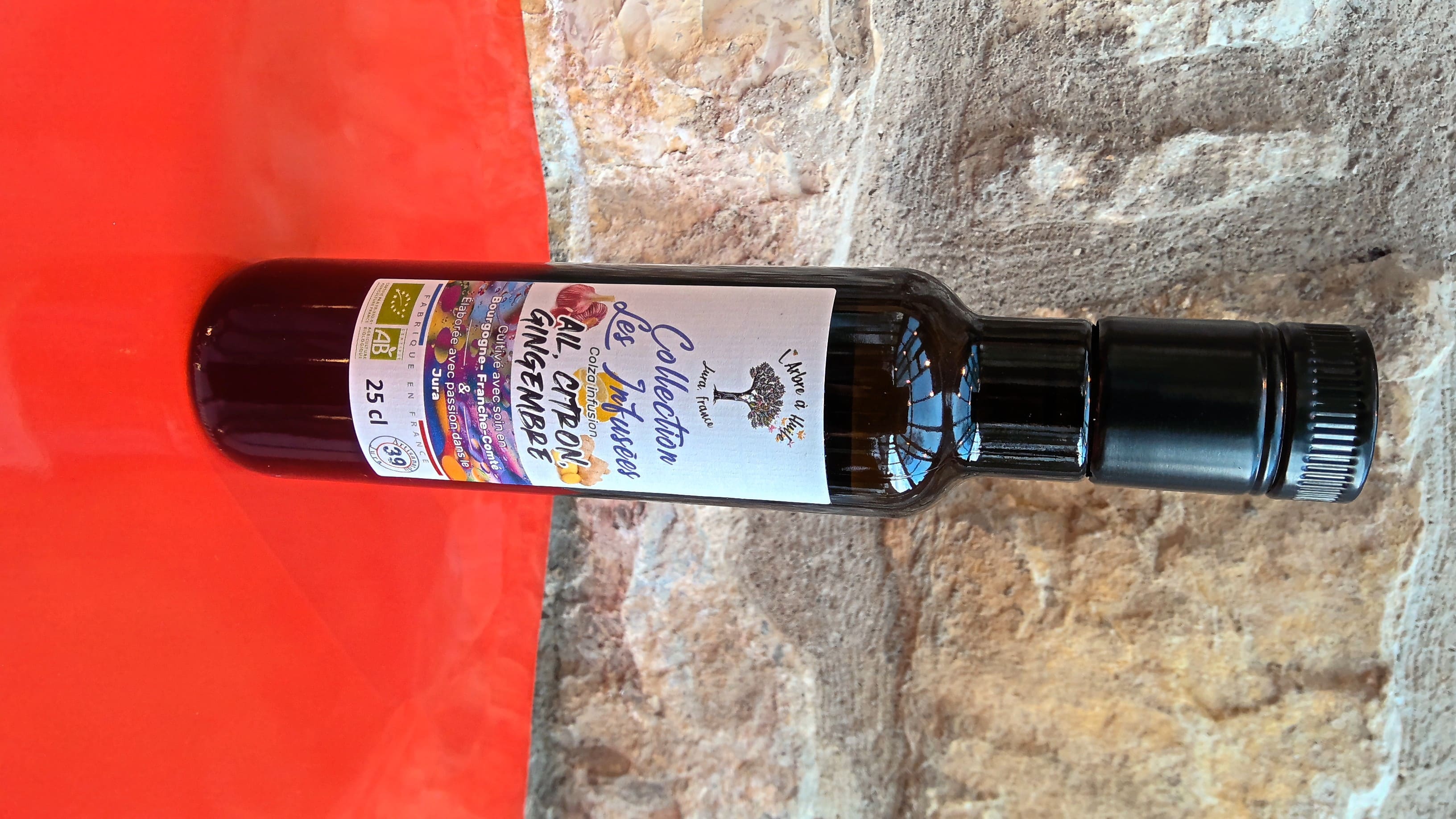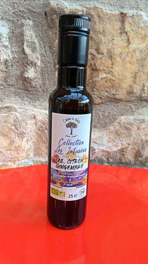Elaborée à partir d’une huile de colza de première qualité d'origine franc comtoise, cette création est délicatement infusée avec de l’ail, du citron et du gingembre pour révéler un bouquet aromatique intense et équilibré.