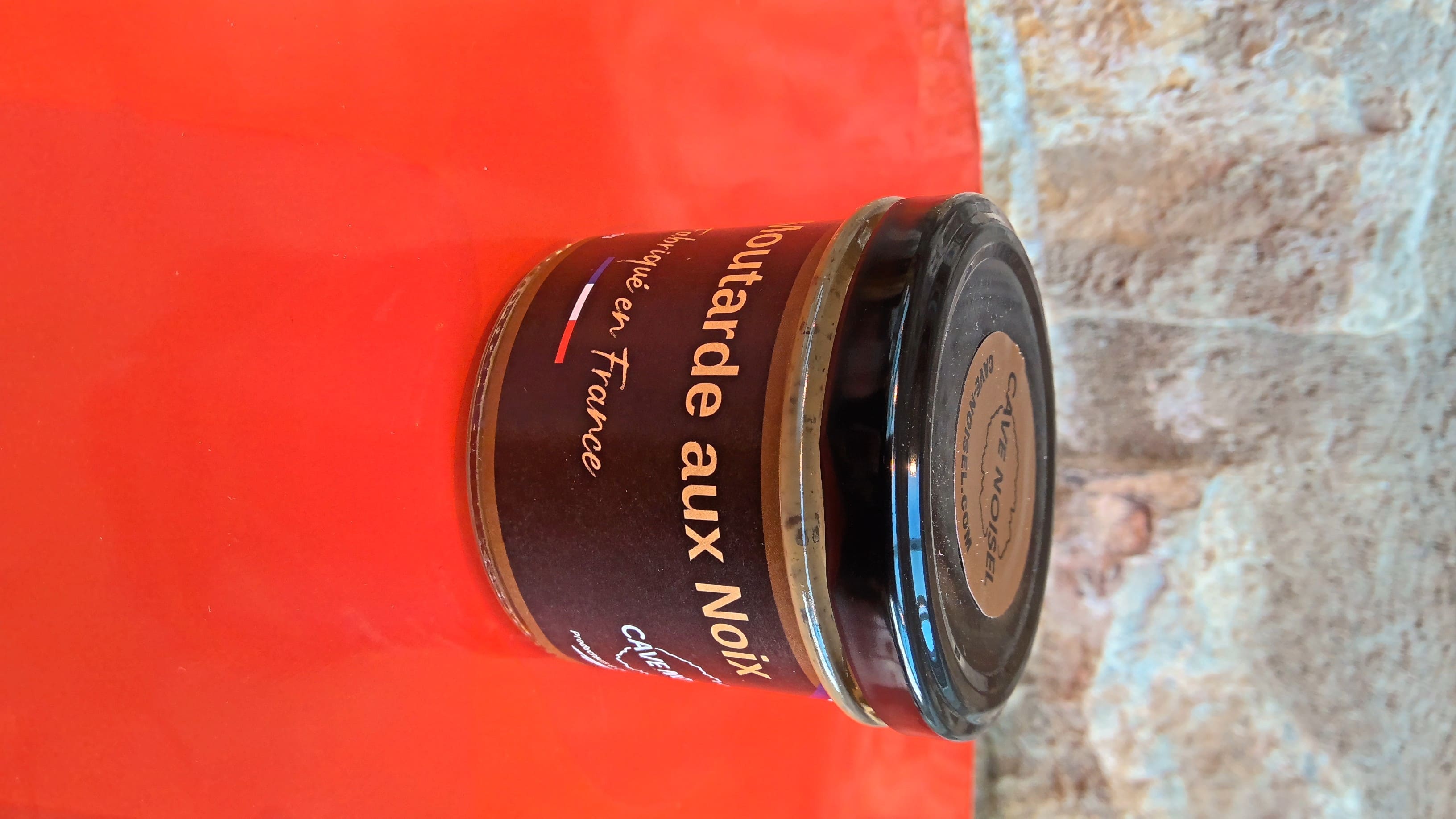 Ingrédients: Moutarde de Dijon (eau, graines de moutarde, vinaigre d'alcool, sel, disulfite de potassium, acide citrique), poudre de noix torréfiée.